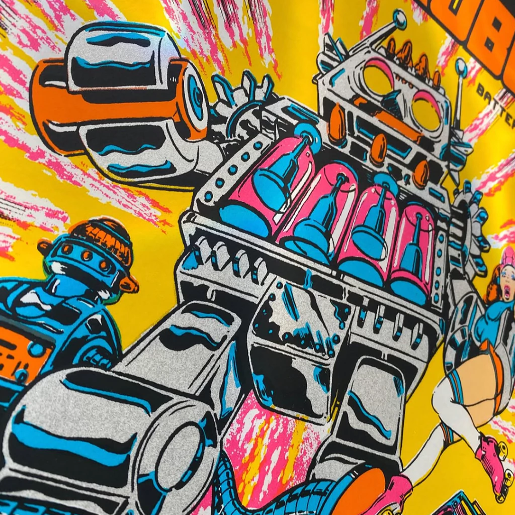 Trabajo inspirado en la cultura pop de finales de los 70s, la ciencia ficción y elementos iconicos de la epoca, ilustrado por Juan Sebastian Bellando, entintado a pincel, escaneado, digitalizado e impreso por Gasser.
